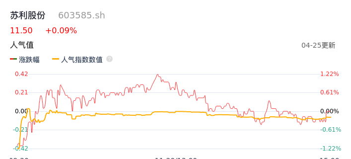 04月25日,苏利股份收报11.50,股价涨幅0.09%,成交金额1686.52万元,换手率0.82%。