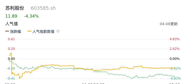 04月08日,苏利股份收报11.89,股价涨幅-4.34%,成交金额1588.64万元,换手率0.73%。