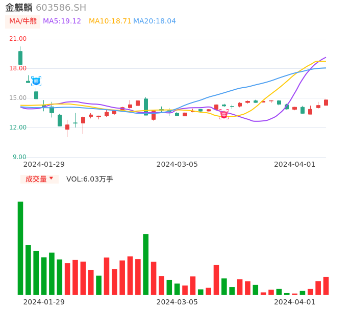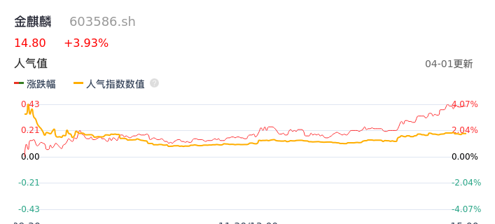 04月01日,金麒麟收报14.80,股价涨幅3.93%,成交金额8780.20万元,换手率3.08%。