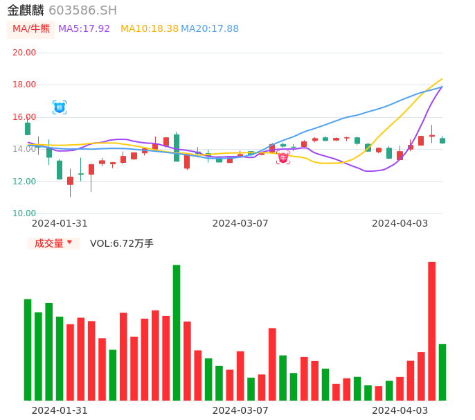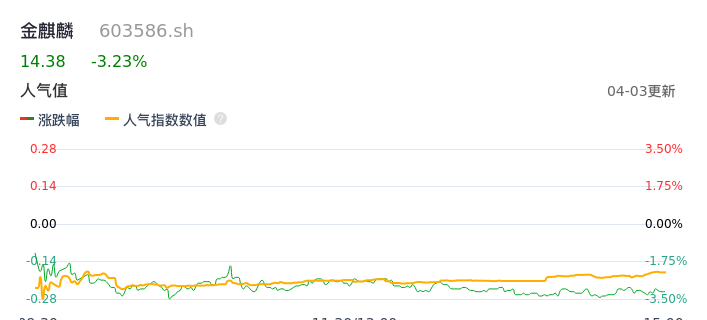 04月03日,金麒麟收报14.38,股价涨幅-3.23%,成交金额9716.10万元,换手率3.43%。