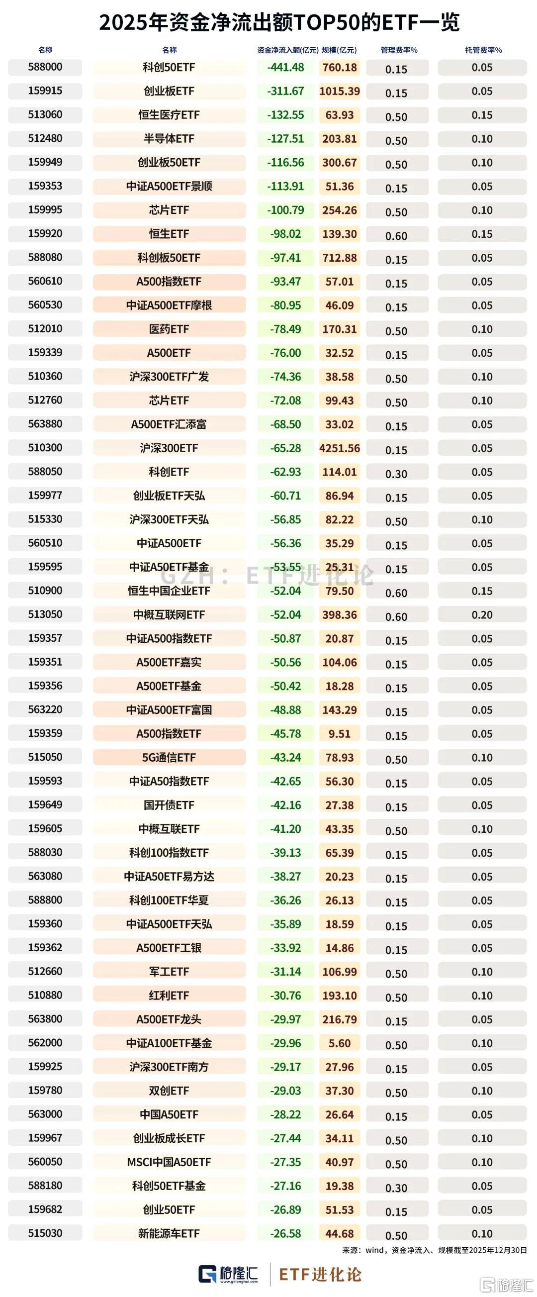 年内超400亿元资金净流出科创50ETF;超300亿元资金净流出创业板ETF;超百亿资金净流出恒生医疗ETF、半导体ETF、创业板50ETF、中证A500ETF景顺、芯片ETF。