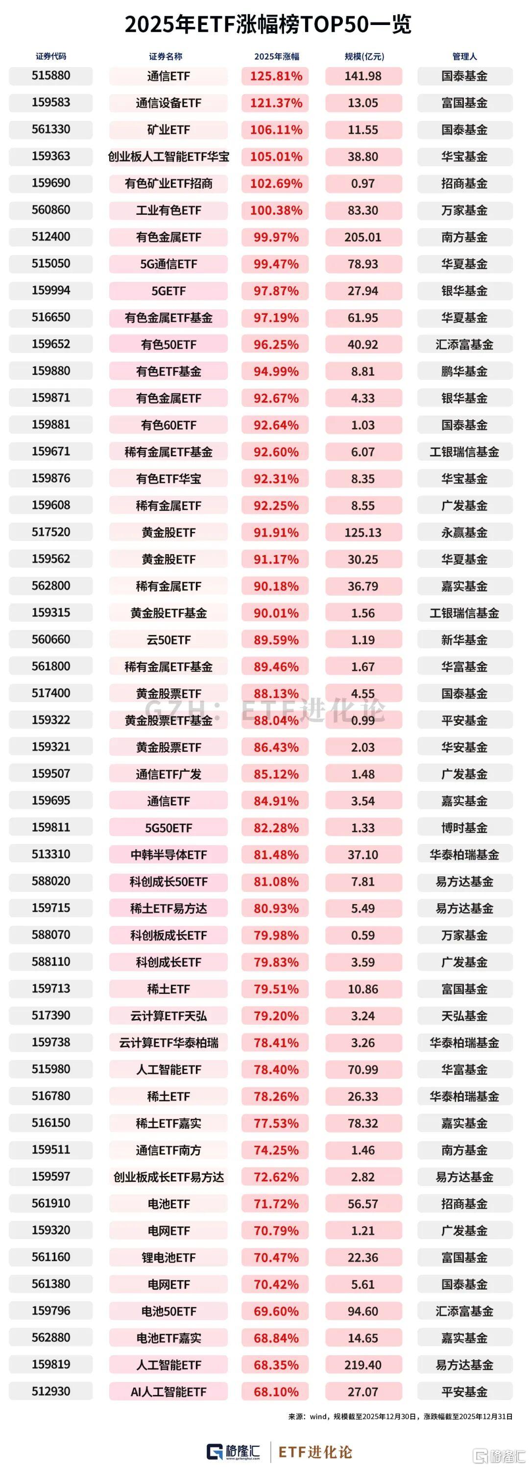 2025年ETF涨幅榜。通信ETF涨幅125.81%夺得年内ETF涨幅榜冠军;通信设备ETF涨幅121.37%,摘下亚军;矿业ETF涨幅106.11%,拿下季军;创业板人工智能ETF华宝、有色矿业ETF招商、工业有色ETF年内均翻倍。