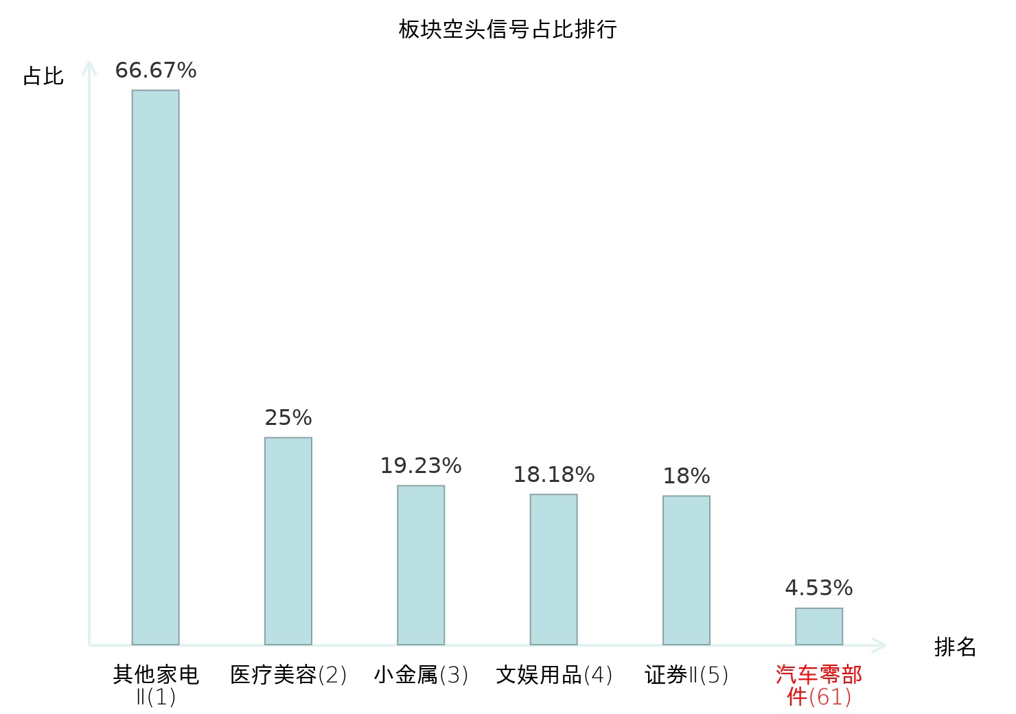 全市场所有行业板块中主力空头信号占比排名中,其他家电Ⅱ板块位居第一。证券Ⅱ板块名次提升最快,较昨日上升108位。