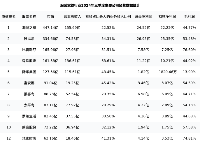 地素时尚最新报告期数据为三季度,下表汇总了服装家纺行业内市值靠前的公司三季度主要经营数据