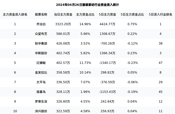 从主力资金流向来看,服装家纺行业今日主力资金流入6.51亿元,在所有申万二级行业中排名:83/131。