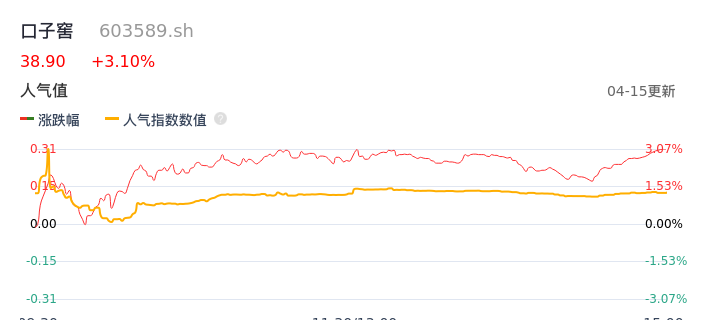 04月15日,口子窖收报38.90,股价涨幅3.10%,成交金额2.96亿元,换手率1.29%。