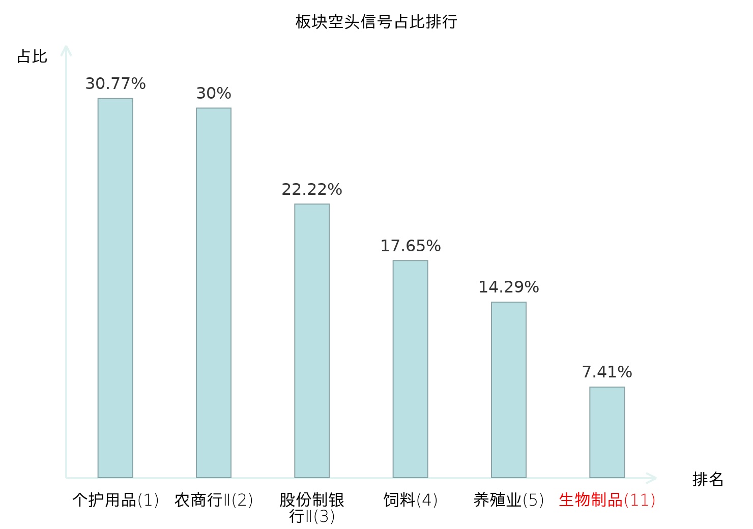 全市场所有行业板块中主力空头信号占比排名中,个护用品板块位居第一。个护用品板块名次提升最快,较昨日上升103位。