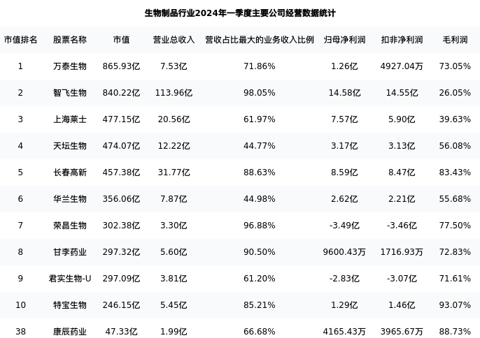 康辰药业最新报告期数据为一季度,下表汇总了生物制品行业内市值靠前的公司一季度主要经营数据