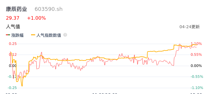 04月24日,康辰药业收报29.37,股价涨幅1.00%,成交金额3284.79万元,换手率0.72%。