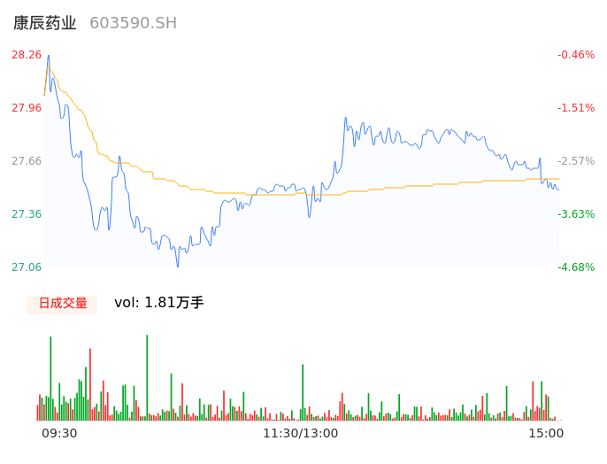 04月16日,康辰药业收报27.52,股价涨幅-3.06%,成交金额4999.30万元,换手率1.15%。