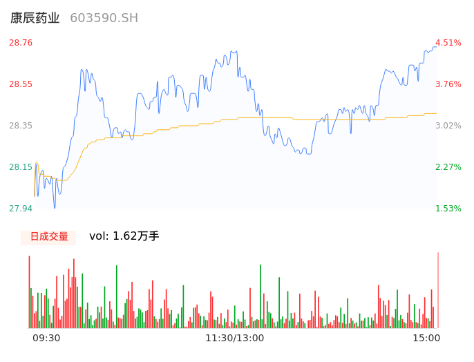 04月17日,康辰药业收报28.76,股价涨幅4.51%,成交金额4604.85万元,换手率1.03%。