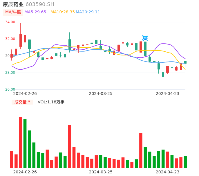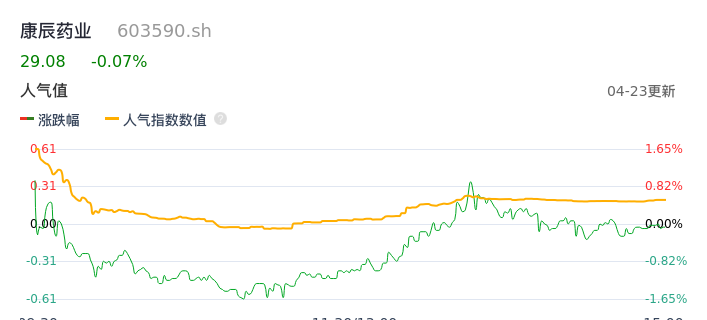 04月23日,康辰药业收报29.08,股价涨幅-0.07%,成交金额3423.78万元,换手率0.75%。
