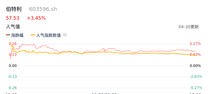 04月30日,伯特利收报57.53,股价涨幅3.45%,成交金额5.95亿元,换手率2.38%。