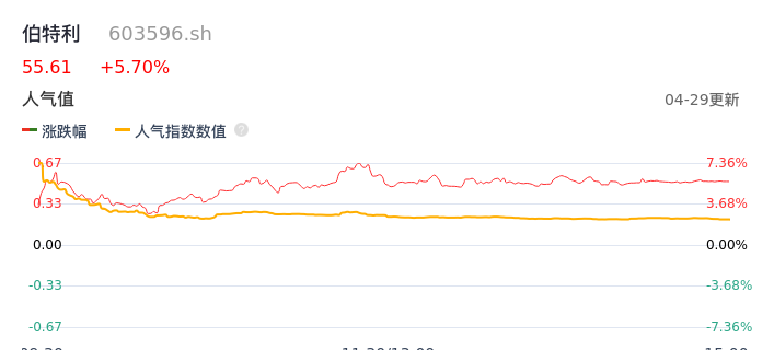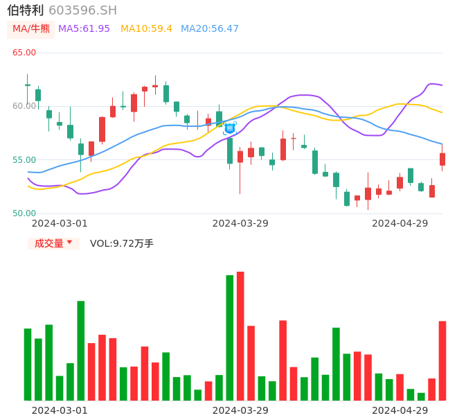 04月29日,伯特利收报55.61,股价涨幅5.70%,成交金额5.38亿元,换手率2.25%。