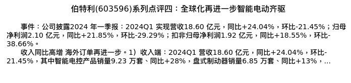 值得注意的是:2024年04月民生证券的崔琰分析师,首次发布关于伯特利的研究报告,标题为:伯特利(603596)系列点评四:全球化再进一步智能电动齐驱。