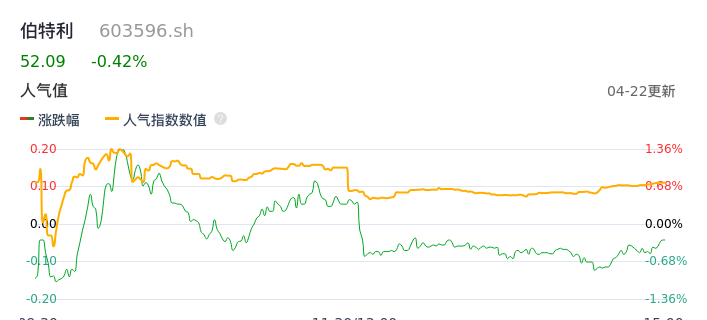 04月22日,伯特利收报52.09,股价涨幅-0.42%,成交金额2.14亿元,换手率0.95%。