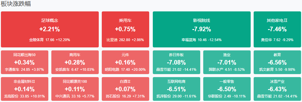 板块方面,足球概念、元件、白酒等少数板块上涨,影视、IP经济、冰雪产业、零售等板块跌幅居前。