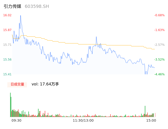 04月12日,引力传媒收报15.48,股价涨幅-4.03%,成交金额2.76亿元,换手率6.58%。