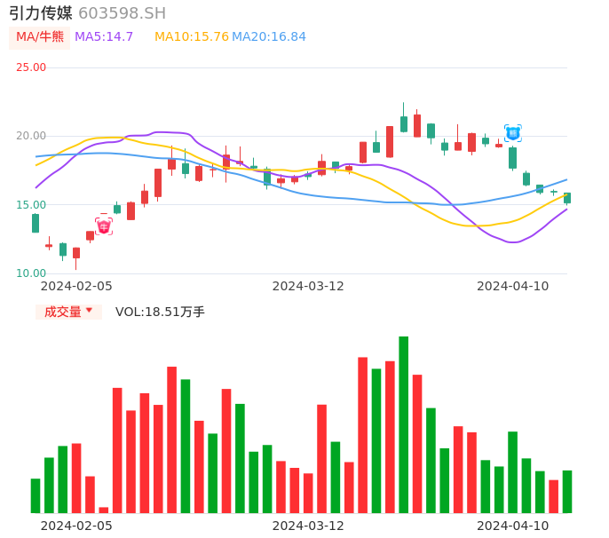 04月10日,引力传媒收报15.13,股价涨幅-5.02%,成交金额2.83亿元,换手率6.91%。