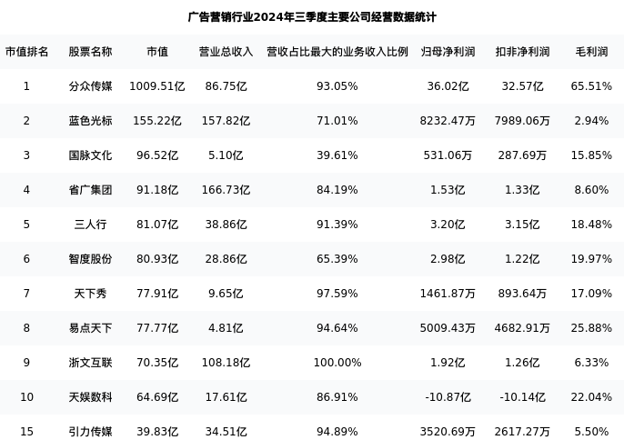 引力传媒最新报告期数据为三季度,下表汇总了广告营销行业内市值靠前的公司三季度主要经营数据