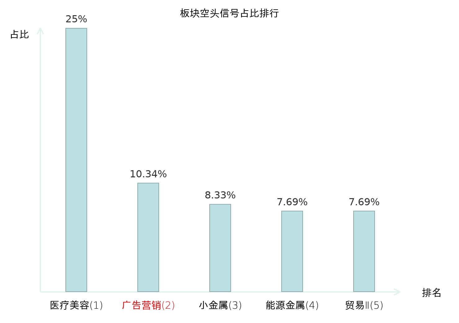 全市场所有行业板块中主力空头信号占比排名中,医疗美容板块位居第一。广告营销板块名次提升最快,较昨日上升113位。