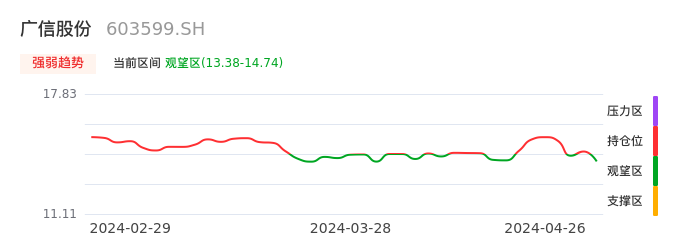 我们来看一下该股的九方特色指标强弱趋势的情况:广信股份近日从持仓区下穿到观望区,股价出现持续性调整行情。短期已经转为空头行情,且下跌动能仍未衰竭。建议继续谨慎观望。