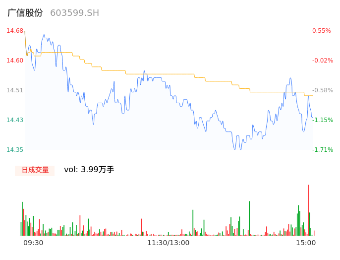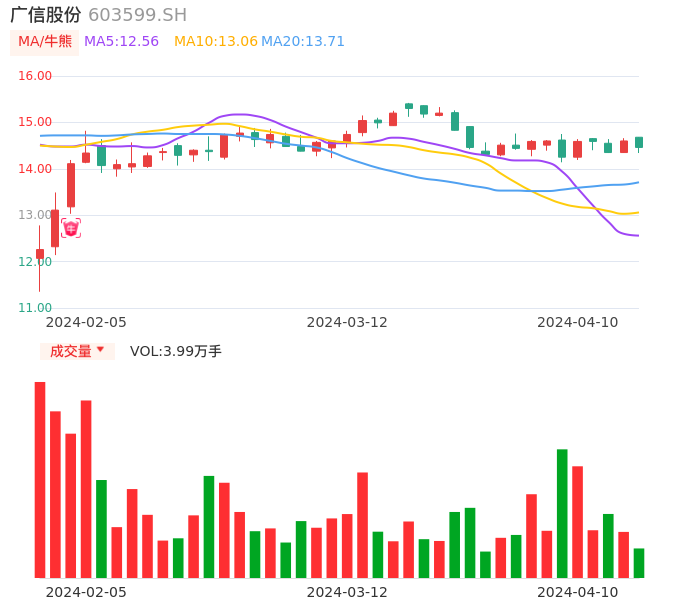 04月10日,广信股份收报14.46,股价涨幅-0.96%,成交金额5783.10万元,换手率0.44%。