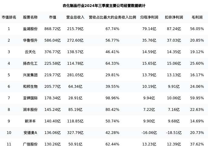 广信股份最新报告期数据为三季度,下表汇总了农化制品行业内市值靠前的公司三季度主要经营数据