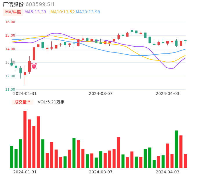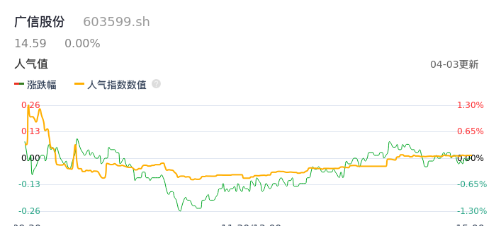 04月03日,广信股份收报14.59,股价涨幅0.00%,成交金额7593.28万元,换手率0.57%。