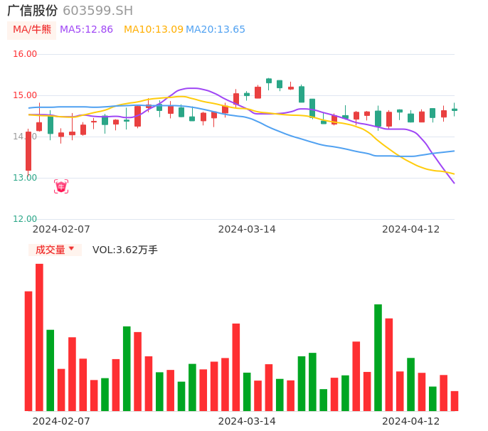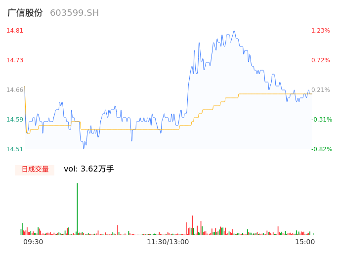 04月12日,广信股份收报14.63,股价涨幅0.00%,成交金额5308.22万元,换手率0.40%。