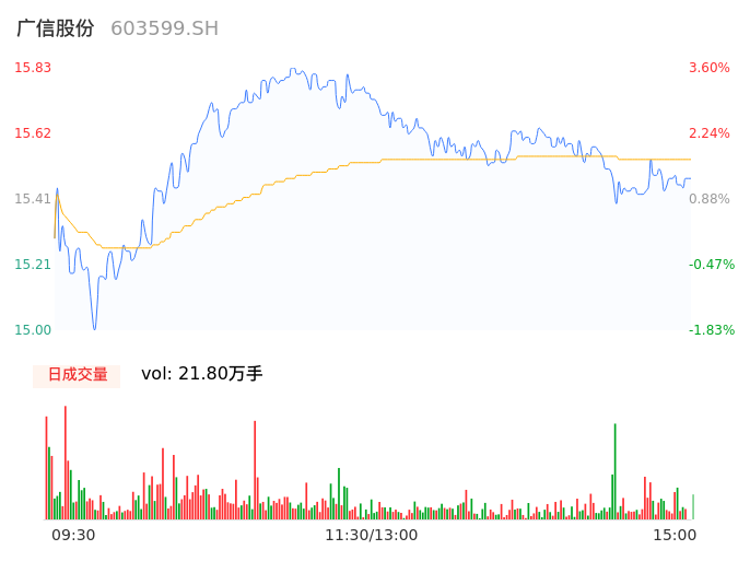 04月22日,广信股份收报15.46,股价涨幅1.18%,成交金额3.39亿元,换手率2.39%。