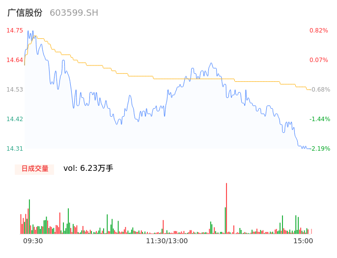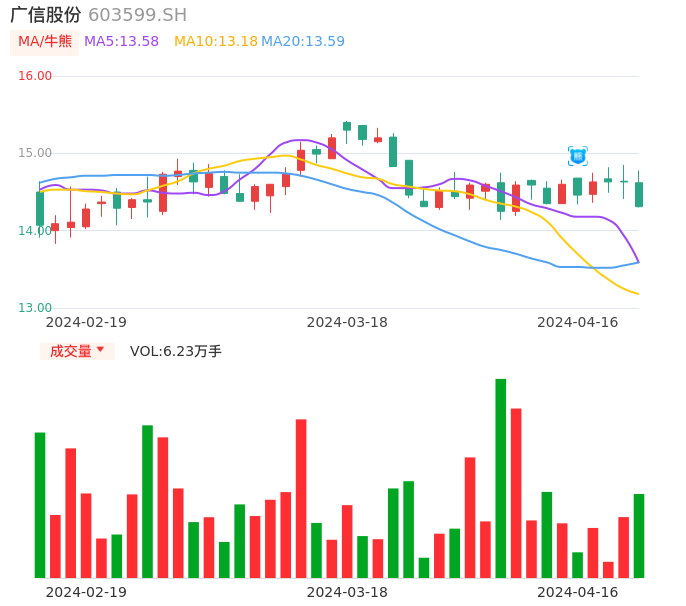 04月16日,广信股份收报14.31,股价涨幅-2.19%,成交金额9054.01万元,换手率0.68%。