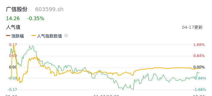 04月17日,广信股份收报14.26,股价涨幅-0.35%,成交金额1.17亿元,换手率0.90%。