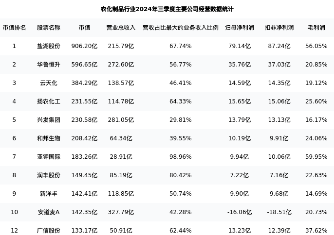 广信股份最新报告期数据为三季度,下表汇总了农化制品行业内市值靠前的公司三季度主要经营数据