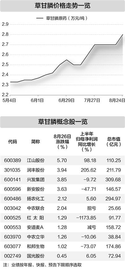 据证券时报·数据宝统计,A股中布局草甘膦的个股共有11只,8月26日集体上涨,平均涨幅2.42%,江山股份、润丰股份、兴发集团涨幅居前,分别为5.7%、3.94%、3.85%。