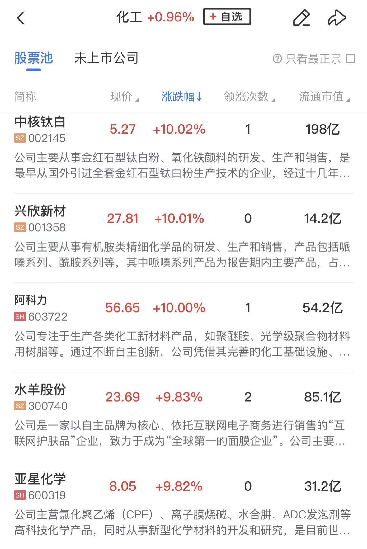 化工股同样表现活跃,中核钛白涨停,江山股份、云图控股涨幅靠前,兴发集团、扬农化工、广信股份等个股跟涨。