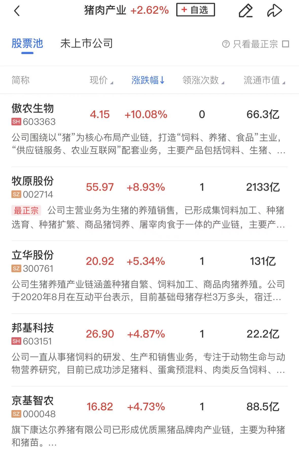 板块上,猪肉、养鸡涨幅居前,傲农生物、天马科技涨停,晓鸣股份、牧原股份、立华股份、圣农发展等个股涨幅居前。消息面上,据发改委,近日全国平均猪粮比价跌至6∶1以下,进入三级预警区间。为促进生猪市场平稳运行,近期国家发改委将会同有关部门开展中央冻猪肉储备收储。华储网公告称,8月25日中央储备冻猪肉收储1万吨。