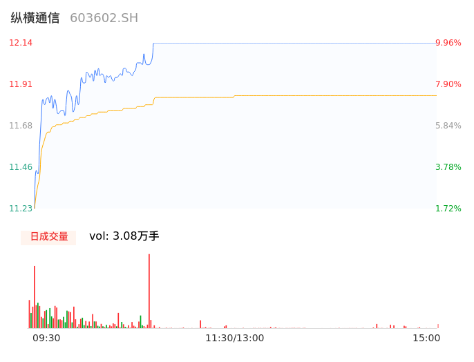 04月17日,纵横通信收报12.14,股价涨幅9.96%,成交金额3651.33万元,换手率1.50%。