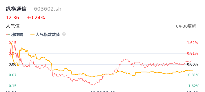 04月30日,纵横通信收报12.36,股价涨幅0.24%,成交金额4813.45万元,换手率1.90%。