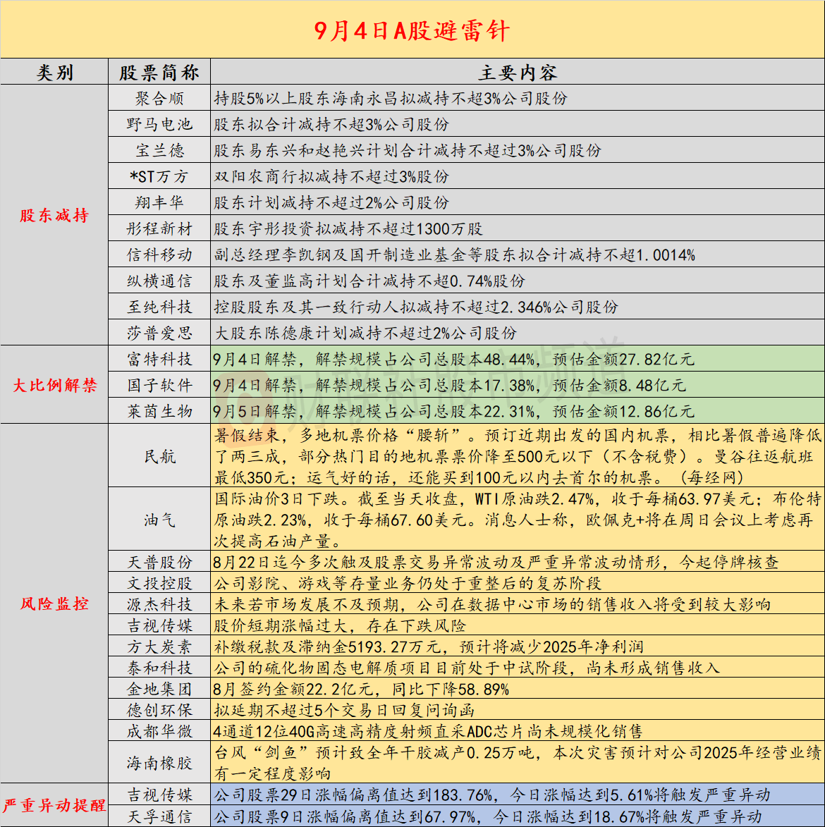 导读:财联社9月4日投资避雷针,近日,A股及海外市场潜在风险事件如下。国内经济信息方面包括:1)国内商品期市夜盘收盘多数下跌,黑色系领跌;2)暑假结束,多地机票价格“腰斩”;公司方面重点关注包括:1)9连板天普股份公告,8月22日迄今多次触及股票交易异常波动及严重异常波动情形,今起停牌核查;2)3天2板文投控股表示,公司影院、游戏等存量业务仍处于重整后的复苏阶段;海外市场重点关注包括:1)美股三大指数收盘涨跌不一,谷歌涨超9%;2)国际油价急跌,消息称欧佩克+将在周日会议上考虑再次提高石油产量。