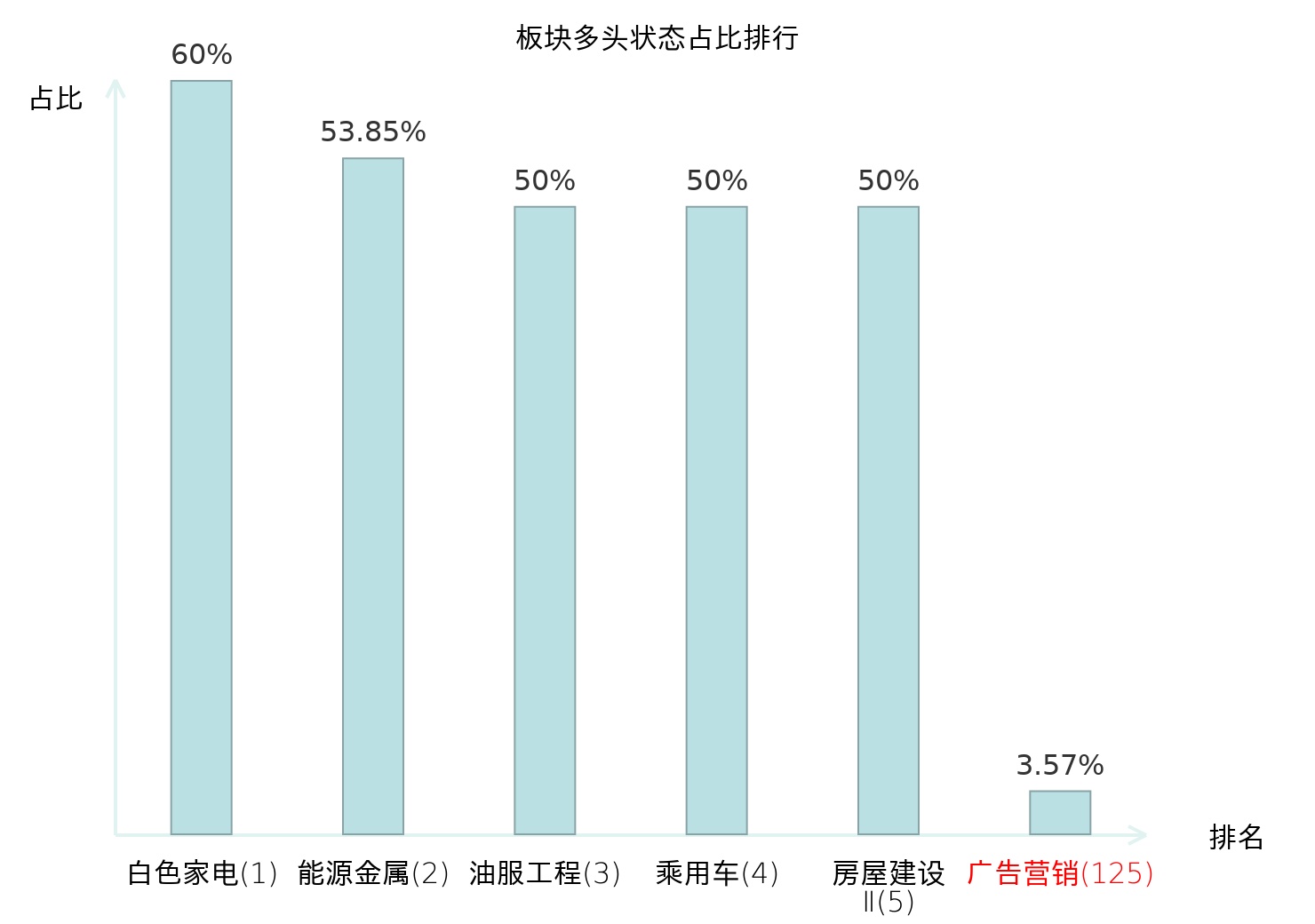 全市场所有行业板块中主力多头状态占比排名中,白色家电板块位居第一。油气开采Ⅱ板块名次提升最快,较昨日上升45位。