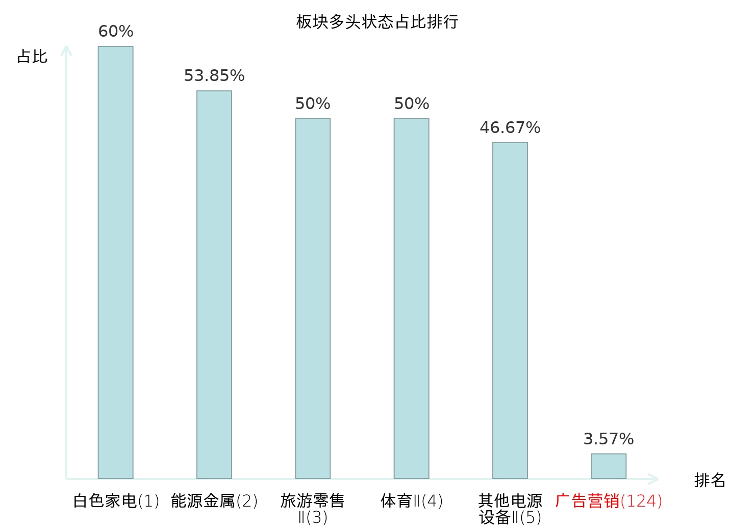 全市场所有行业板块中主力多头状态占比排名中,白色家电板块位居第一。体育Ⅱ板块名次提升最快,较昨日上升127位。