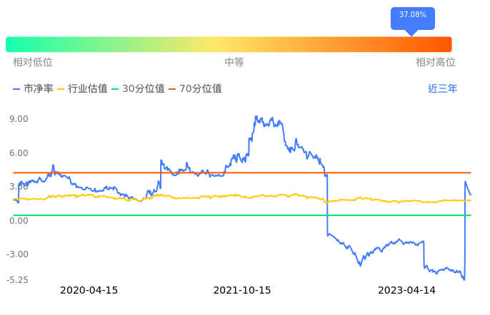 *ST博天当前市净率PB为2.35,在所属的环境治理中,市净率PB排69,前五名分别为中山公用市净率0.69、启迪环境市净率0.69、碧水源市净率0.73、维尔利市净率0.76、武汉控股市净率0.84。*ST博天当前市净率PB为2.35,超过近3年37.08%的历史数据。