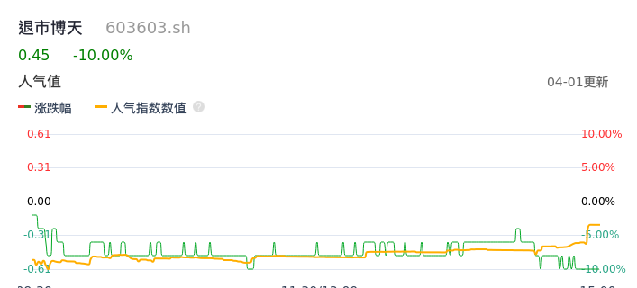04月01日,退市博天收报0.45,股价涨幅-10.00%,成交金额1440.65万元,换手率3.79%。