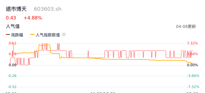 04月08日,退市博天收报0.43,股价涨幅4.88%,成交金额686.21万元,换手率1.98%。