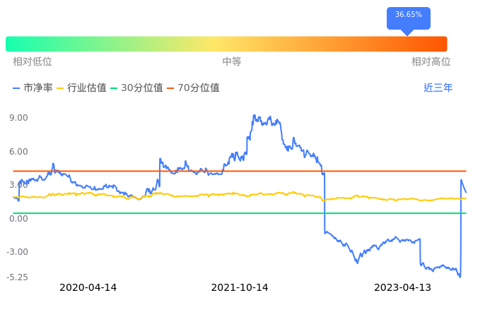 *ST博天当前市净率PB为2.31,在所属的环境治理中,市净率PB排69,前五名分别为中山公用市净率0.69、启迪环境市净率0.70、碧水源市净率0.73、维尔利市净率0.75、武汉控股市净率0.85。*ST博天当前市净率PB为2.31,超过近3年36.65%的历史数据。