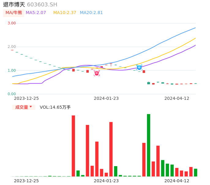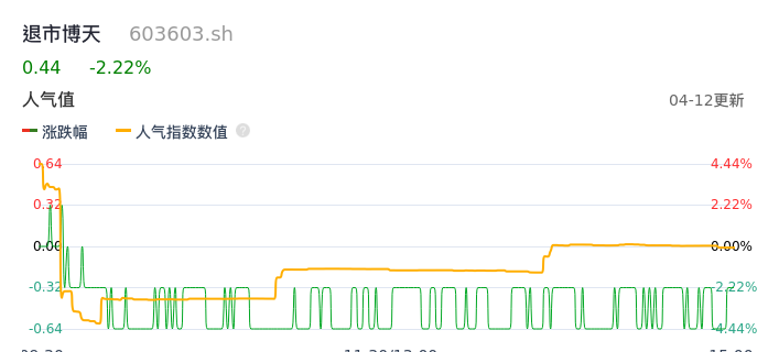 04月12日,退市博天收报0.44,股价涨幅-2.22%,成交金额647.03万元,换手率1.79%。