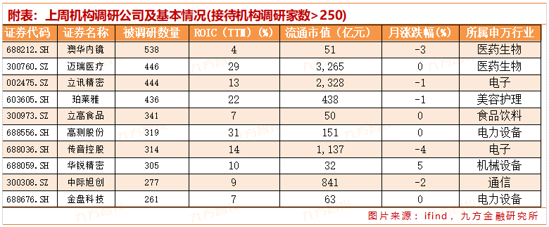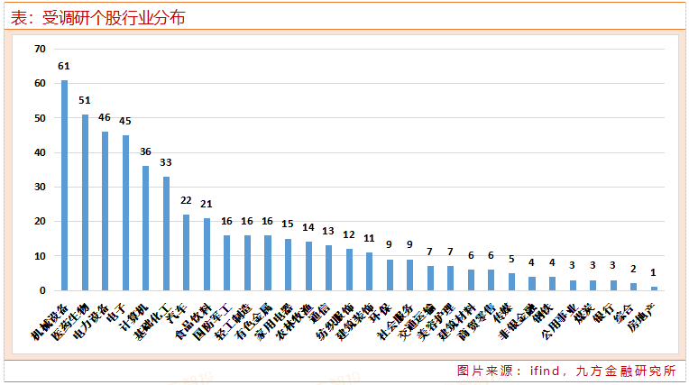 从行业分布来看,本周机械设备有61家上市公司接受调研,医药生物有51家上市公司接受调研,电力设备、电子均有超40家上市公司接受调研。
