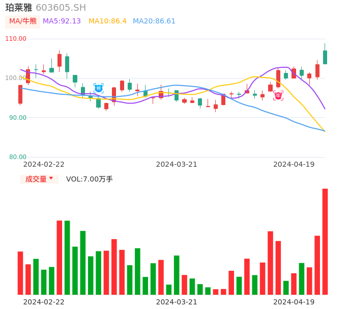 04月19日,珀莱雅收报103.60,股价涨幅0.14%,成交金额7.39亿元,换手率1.77%。