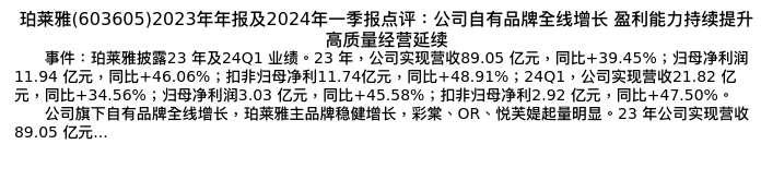 值得注意的是:2024年04月民生证券的分析师,首次发布关于珀莱雅的研究报告,标题为:珀莱雅(603605)2023年年报及2024年一季报点评:公司自有品牌全线增长 盈利能力持续提升 高质量经营延续。
